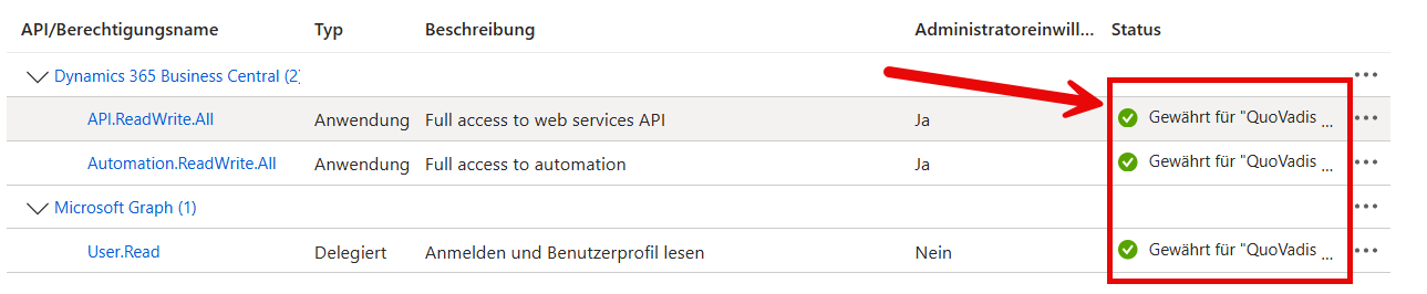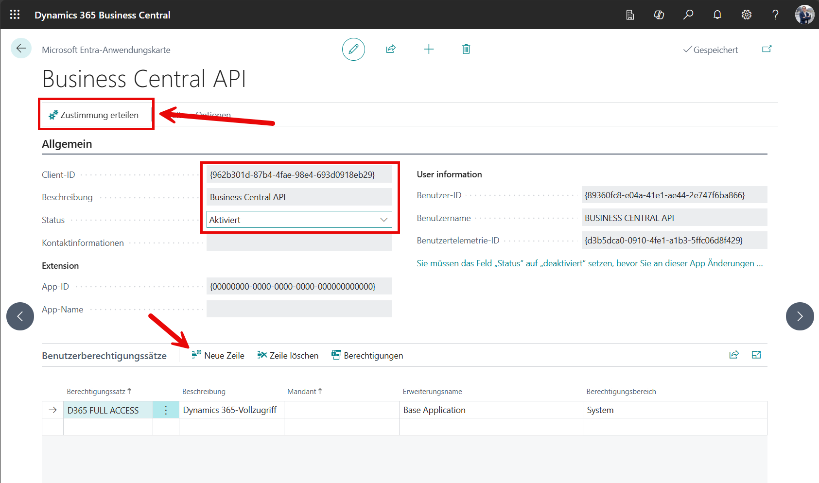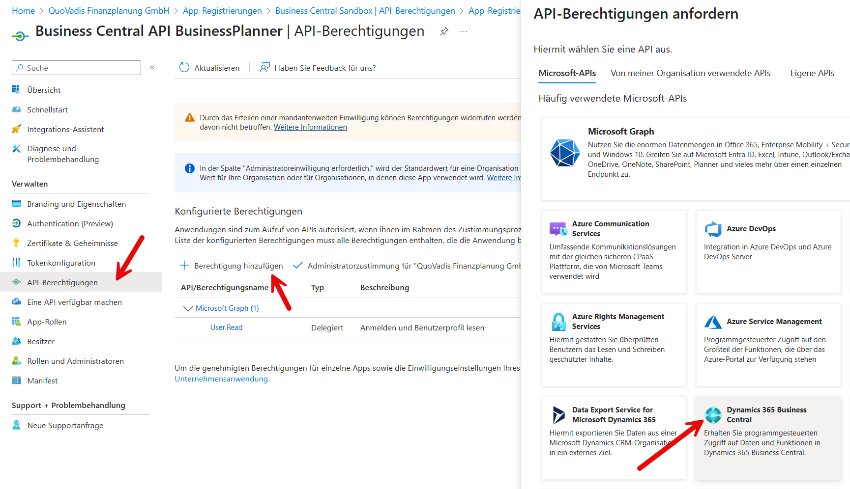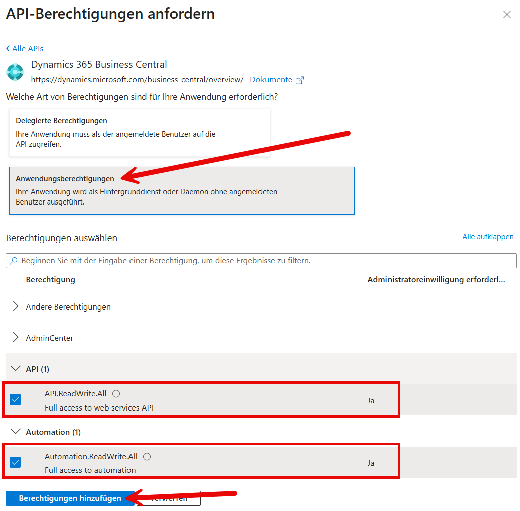 Dann müssen der API noch Berechtigungen zugewiesen werden, damit sie überhaupt auf die BC-API zugreifen darf.