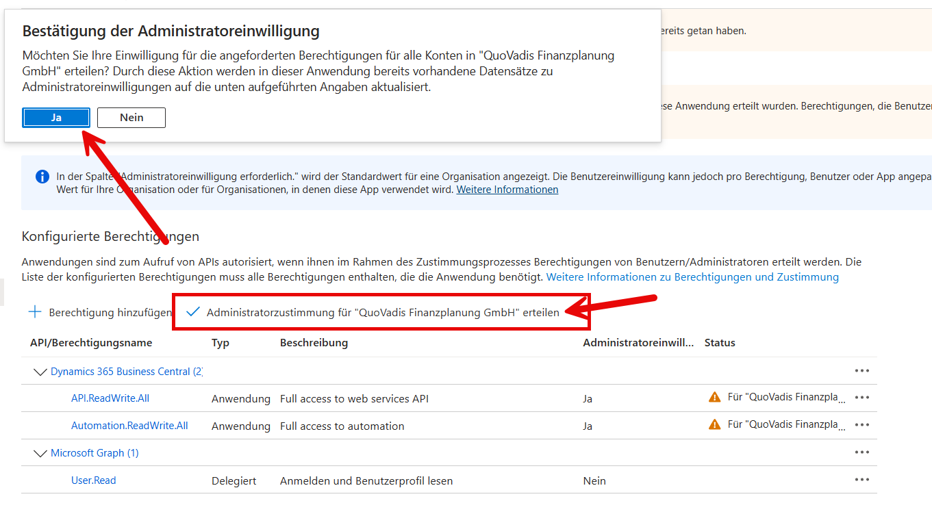 - Konfiguration der Entra ID-Anwendung in Business Central mit Konfiguration der Berechtigungen