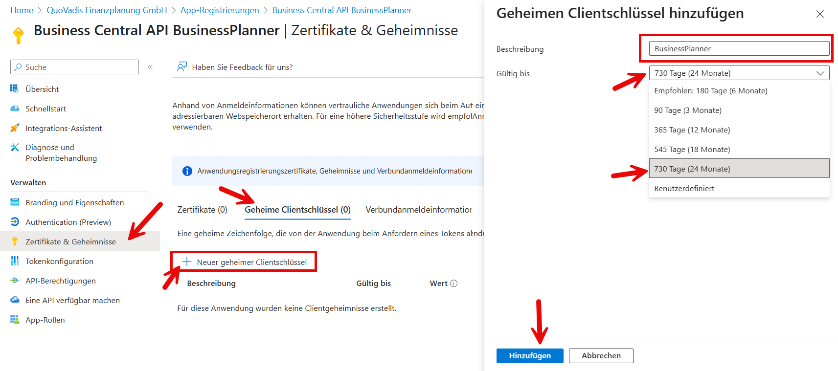 Nun muss noch ein "Geheimer Clientschlüssel" erstellt werden - eine Art Passwort - , damit der BusinessPlanner diese API dann für Abfragen nutzen kann: