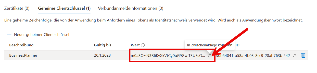 Nach der Erstellung wird der Schlüssel einmalig angezeigt und muss hier direkt kopiert und gesichert werden. Wir müssen den "Wert" später im BusinessPlanner-Import eintragen.