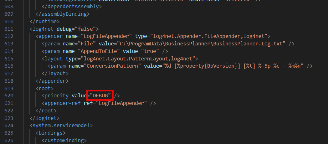 In der Datei "C:\Program Files\BusinessPlanner Advisory\BusinessPlanner\BusinessPlanner.Client.exe.config" kann der Log-Level von ERROR auf DEBUG gestellt werden: