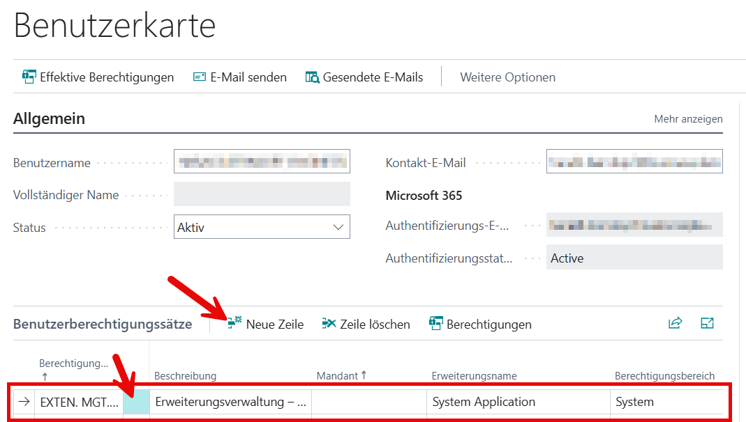 Unter "Benutzerberechtigungssätze" auf "Neue Zeile" klicken und die Berechtigung "EXTEN. MGT. - ADMIN" (Erweiterungsverwaltung) hinzufügen: