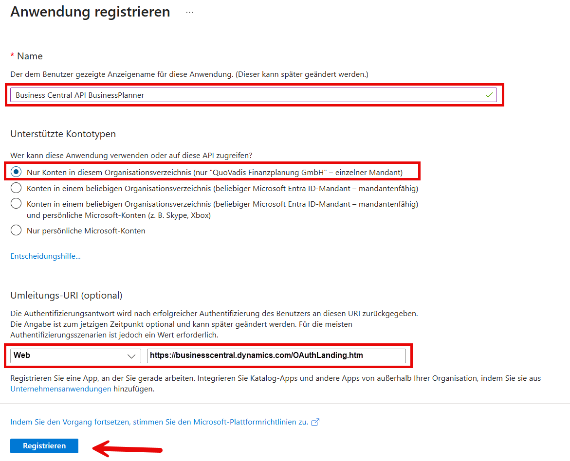 Damit der BusinessPlanner für den Datenimport eine Verbindung zu Business Central herstellen kann, muss zunächst ein grundsätzlicher Zugriff auf die API von Business Central eingerichtet werden: Es muss in Microsoft Entra ID eine Anwendung für diesen Zweck registriert werden.